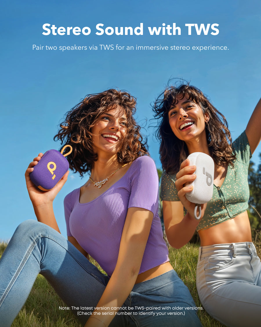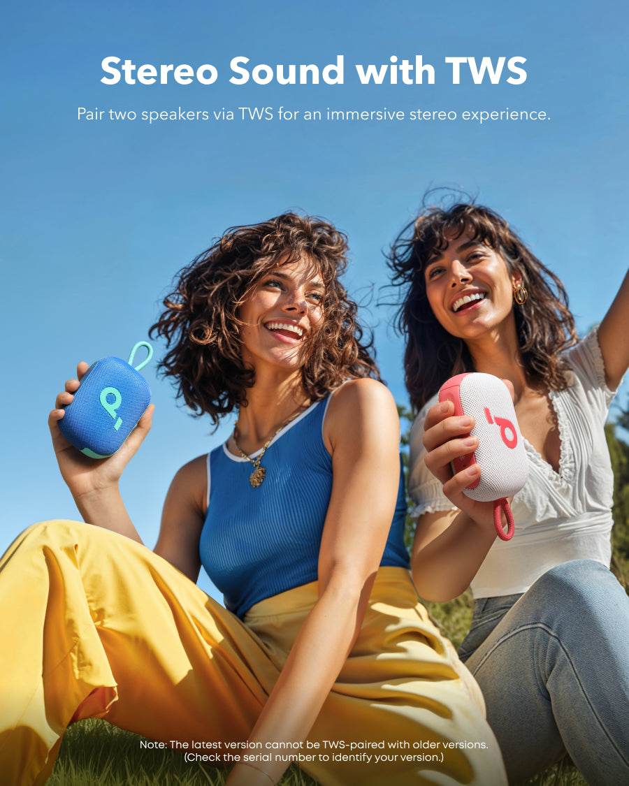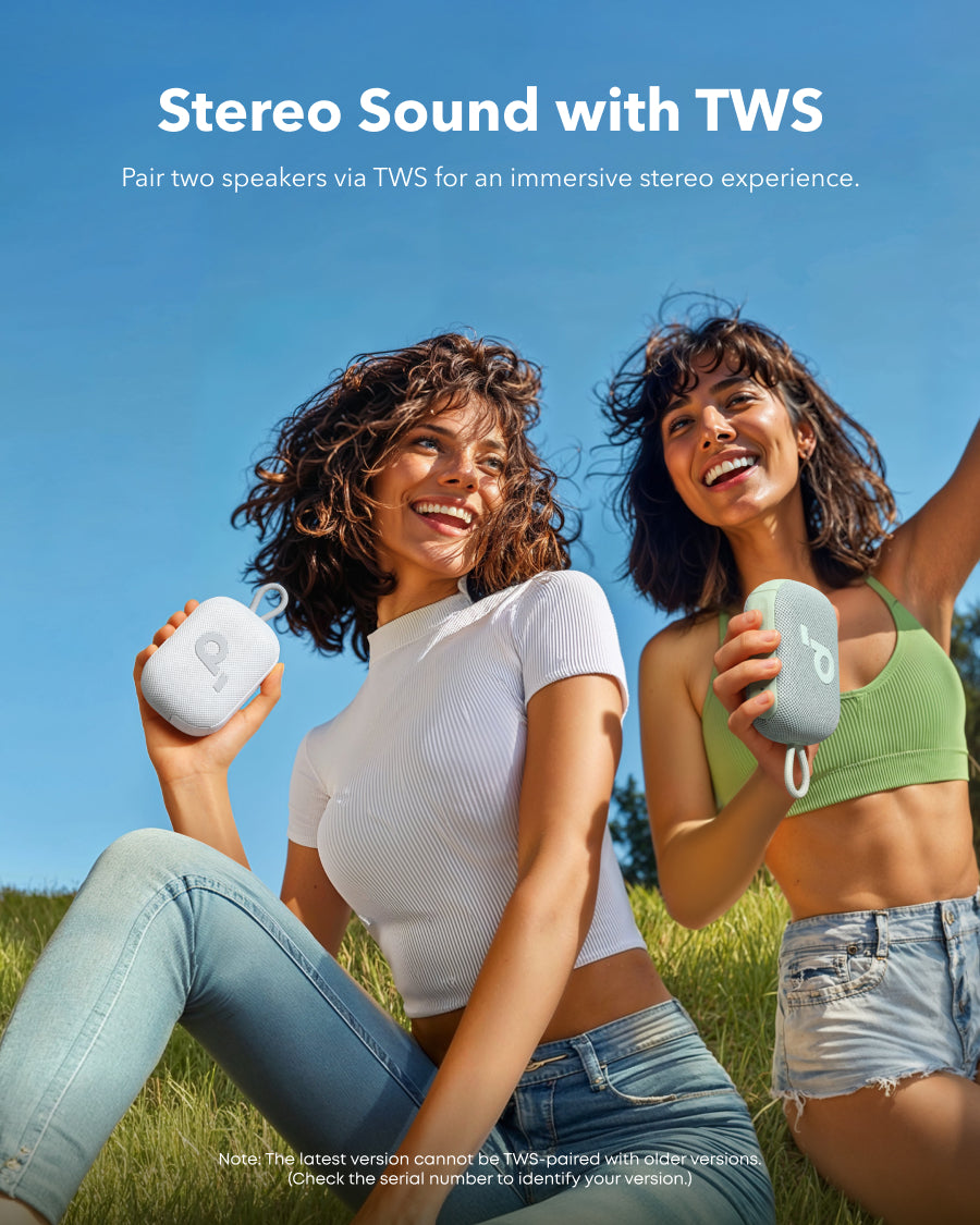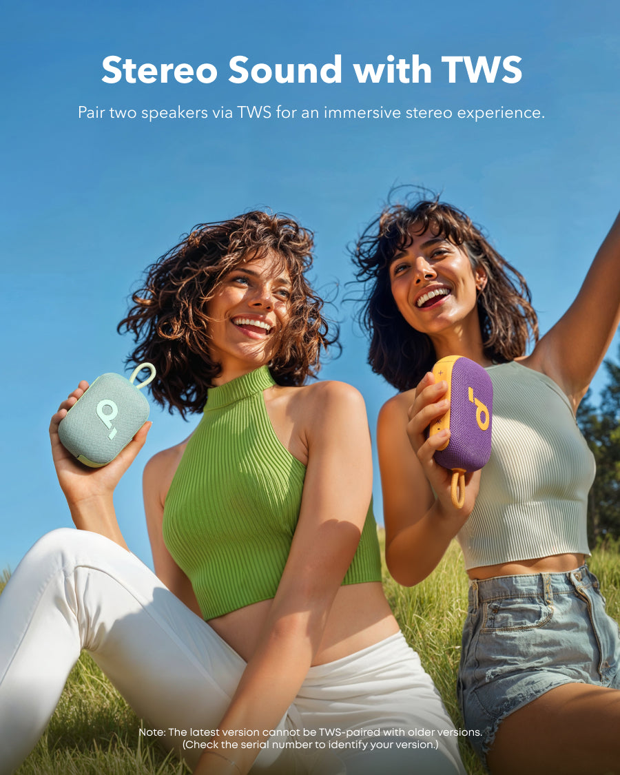 - Supports Wireless Stereo Pairing: Enable True Wireless Stereo (TWS) pairing to wirelessly connect two speakers for richer, more immersive sound with stereo separation. To enable TWS pairing, connect one speaker to your smartphone, then press and hold the Bluetooth button on both speakers for 2 seconds.