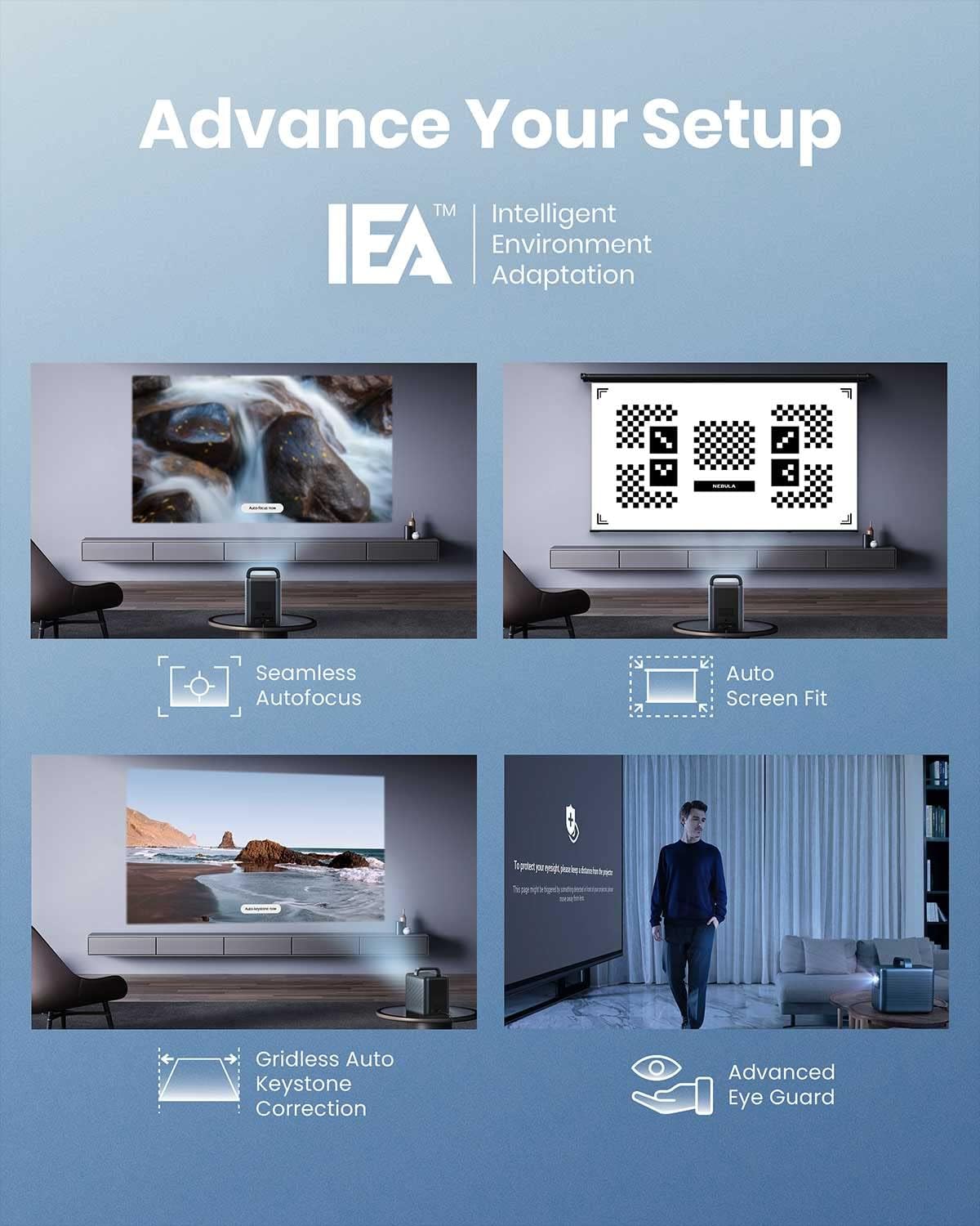 Setup is a Snap: Intelligent Environment Adaptation (IEA) Technology creates a theater in seconds. Watch your room be analyzed to create a perfect-fitting screen without any interruptions.