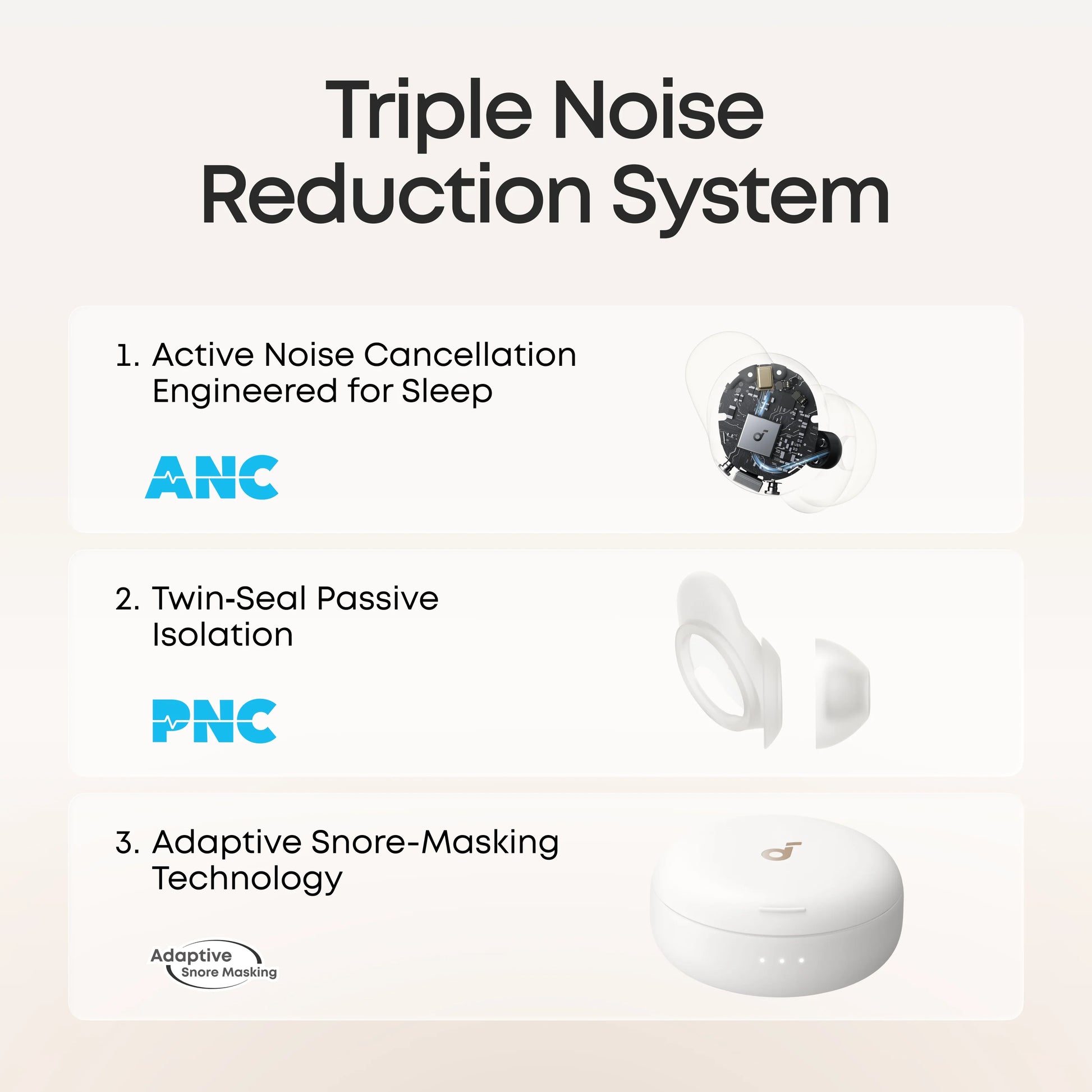 Triple Noise‑Reduction System: Combines Active Noise Cancellation, Passive Isolation, and Adaptive Snore-Masking Technology to create a calmer sleep environment. Reduces a wide range of sounds heard at night including snoring, appliance hum, pet movement sounds, and traffic noise.