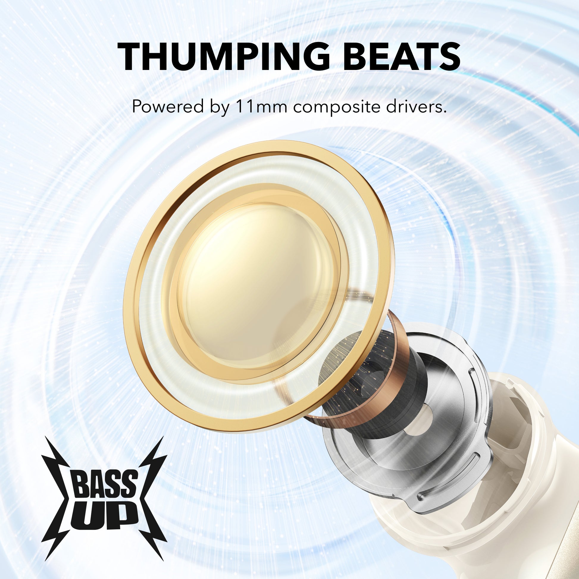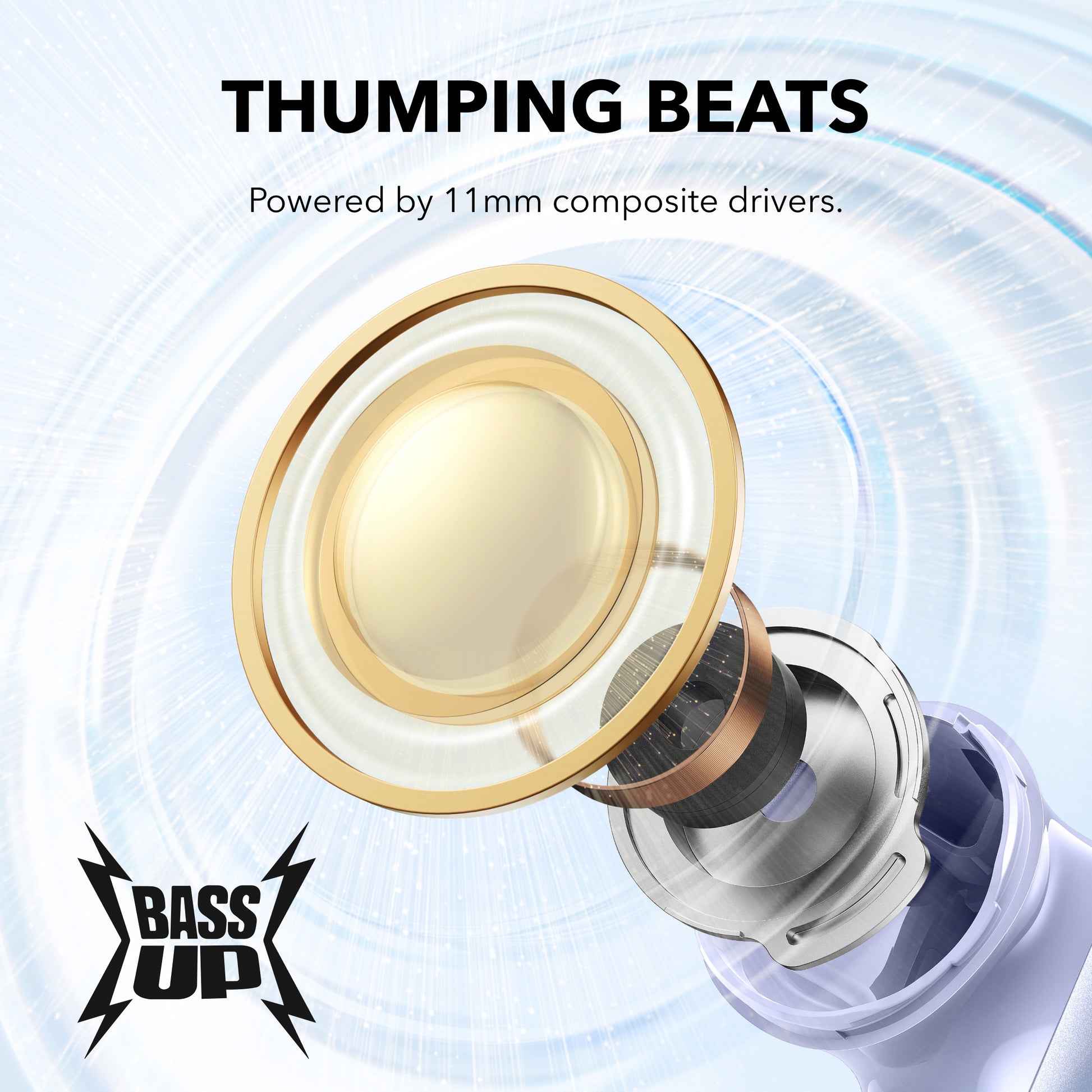 Thumping Beats: soundcore P40i wireless earbuds feature 11mm composite drivers for an intensive audio experience, enhanced with BassUp™ technology for real-time intense bass.